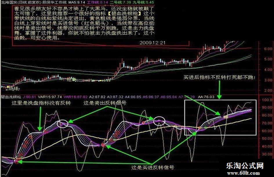 看见很多朋友好不容易才骑上了大,还没坐稳就被颠了下来,实在是太可惜了,这里我推荐一个很好的指标【碧血洗银枪】这个指标主要观察带状线的白线和紫线决定进出,黄色粗线是强弱分界,当线带在低位扭转白线上穿紫线时是信号(红色箭头),当线带在高位扭转白线下穿紫线时是卖出信号,线带没彻底反转千万别跑,这是主力,坚决与庄共舞。掌握了这件利器,你就不怕被主力洗盘洗出来了。这个指标不含,可安心使用。