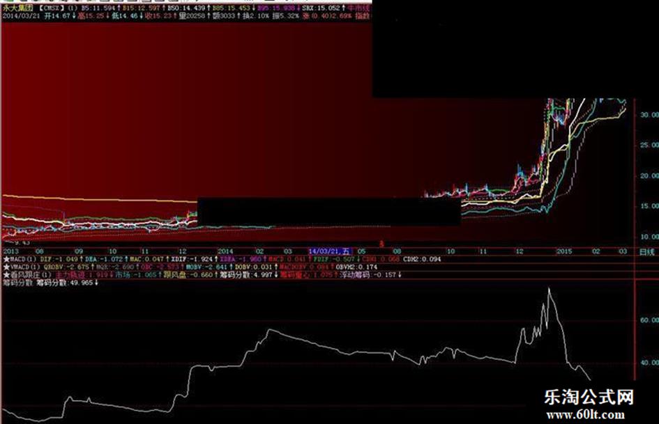 是最为常见的,这一表述是经不起推敲的,(获利盘为85%的成本分布-获利盘为15%的成本分布)/((获利盘为100%的成本分布-获利盘为0%的成本分布))*100这样的表述在逻辑上是正确的,但是,有的软件获利盘为100%的成本分布,COST(0)是没有数值的,特别是它在逻辑上仍然存在缺陷,主要是它忽视了筹码重心对集中度的影响。本人这个指标源码正是针对这一缺陷而改写的。本人再次强调的是即使是这样它也是存在逻辑缺陷的,因为这样的表述只是反映了筹码的价差,没有真实地反映出筹码柱长短对集中度的主要构成因素,说穿了就是量的问题。筹码分散度小于25为集中度较高,另外,使用筹码分散度需要配合筹码重心指标,这样就能知道是高位集中还是低位集中。 筹码分散:如果获利盘为95%的成本分布-获利盘为50%的成本分布<获利盘为50%的成本分布-获利盘为5%的成本分布,返回获利盘为95%的成本分布-获利盘为15%的成本分布,否则返回如果获利盘为95%的成本分布-获利盘为50%的成本分布>获利盘为50%的成本分布-获利盘为5%的成本分布,返回获利盘为85%的成本分布-获利盘为5%的成本分布,否则返回(获利盘为85%的成本分布-获利盘为5%的成本分布+获利盘为95%的成本分布-获利盘为15%的成本分布)/2/(获利盘为99.9%的成本分布-获利盘为0.1%的成本分布)*100,画白色