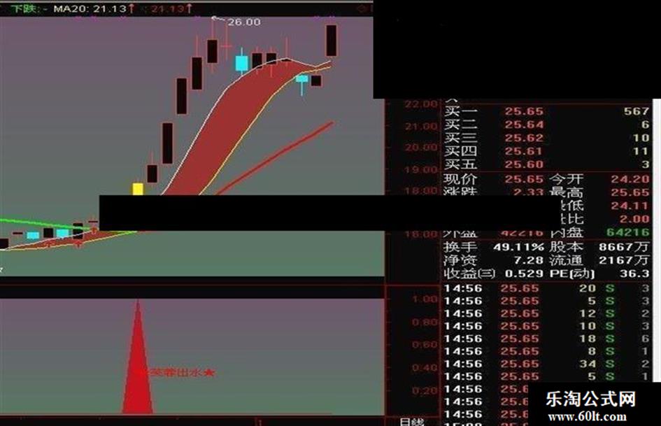 DRAWGBK(CURRBARSCOUNT=1, RGB(110,600,108),RGB(88,120,100),0,'',0);DRAWGBK(CURRBARSCOUNT=1, RGB(110,600,108),RGB(88,120,100),0,'',0);AAA:=(3*C+H+L+O)/6;VAR1:=(8*AAA+7*REF(AAA,1)+6*REF(AAA,2)+5*REF(AAA,3)+4*REF(AAA,4)+3*REF(AAA,5)+2*REF(AAA,6)+REF(AAA,8))/36;VAR2:=(HHV(VAR1,5)+HHV(VAR1,10)+HHV(VAR1,20))/3;VAR3:=(LLV(VAR1,5)+LLV(VAR1,10)+LLV(VAR1,20))/3;VAR4:=(HHV(VAR2,5)+HHV(VAR2,10)+HHV(VAR2,20))/3;VAR5:=(LLV(VAR3,5)+LLV(VAR3,10)+LLV(VAR3,20))/3;VAR6:=(LLV(VAR1,2)+LLV(VAR1,4)+LLV(VAR1,6))/3;DRAWBAND(VAR1,RGB(155,50,50),VAR6,RGB(250,250,0));DRAWKLINE(HIGH,OPEN,LOW,CLOSE);短线:VAR1,COLORWHITE;中线:VAR6,COLORYELLOW;下跌:IF(VAR1=VAR6,VAR6,DRAWNULL),COLORGREEN;N1:=5;N2:=7;N3:=11;EM1:=EMA(C,N1),COLORWHITE;EM2:=EMA(C,N2),COLORRED;EM3:=EMA(C,N3),COLORGREEN;TJ:=BETWEEN(EM2,EM1,EM3);MA20:MA(C,20)LINETHICK3;IF(MA20>REF(MA20,1),MA20,DRAWNULL)COLORRED,LINETHICK3;立桩量:=FILTER(TJ=0,5);{芙蓉出水} MA200:=EMA(CLOSE,20); MA400:=EMA(CLOSE,40); MA600:=EMA(C,60); AA:=BARSLAST(MA400>MA600 AND (MA200=MA400 OR MA200>MA400)); BB:=REF(COUNT(C<MA600,AA)=AA,1); CC:=CROSS(C,MA600) AND VOL>MA(VOL,5) AND (C-REF(C,1))/REF(C,1)*100>3; 芙蓉出水:=BB AND CC; STICKLINE(芙蓉出水,C,O,2,0),COLORYELLOW;DRAWTEXT(芙蓉出水,L-L*0.0005,'芙蓉出水'),COLORYELLOW;