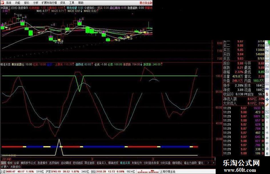 黄色底横轴探底震仓,红色线上穿趋势线买入,买入和卖出信号清晰