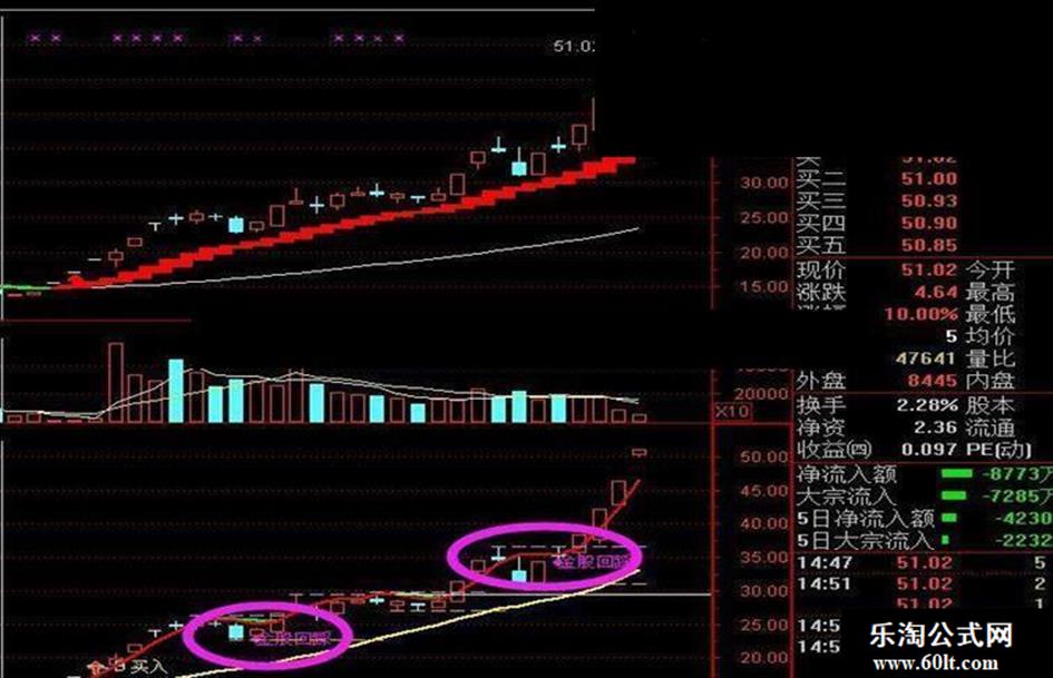DRAWTEXT(VAR5>=1,L,'金股回踩'),COLORMAGENTA;