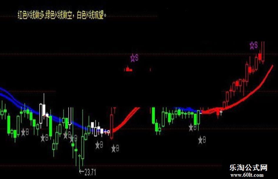 DRAWTEXT(C AND CURRBARSCOUNT=80 ,AAA, '红色K线做多,绿色K线做空,白色K线观望。 '),COLORYELLOW;
