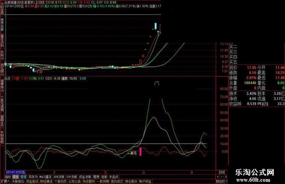 用法:1:黄线大于绿线基本都是短线底部,k线往上走势,出现黑马的位置如果出现大幅上涨拉升,量能放大现象,牛股就在眼前;
