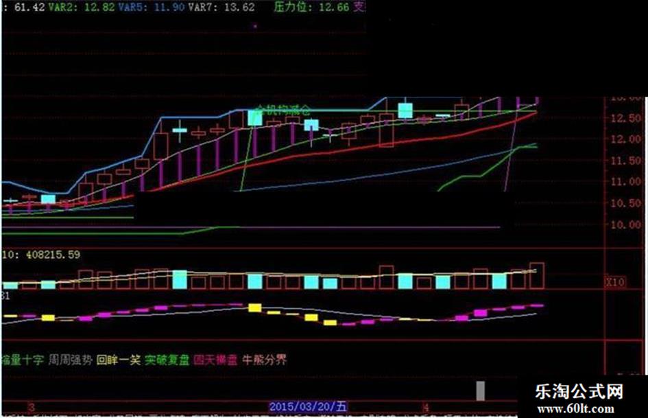 DRAWTEXT(IF(COUNT(CLOSE<REF(CLOSE,1),8)/8>0.3 AND COUNT(VAR12>VAR13,3) AND REF(LOW,1)=LLV(LOW,120) AND CLOSE>OPEN,1,0),LOW,'★机构进场'),COLORYELLOW;
