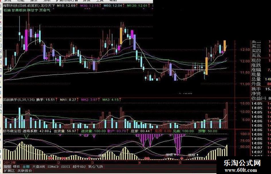 DRAWTEXT(CROSS(散户,庄家) AND 散户<30,庄家,'低吸 !'), ,COLORWHITE;