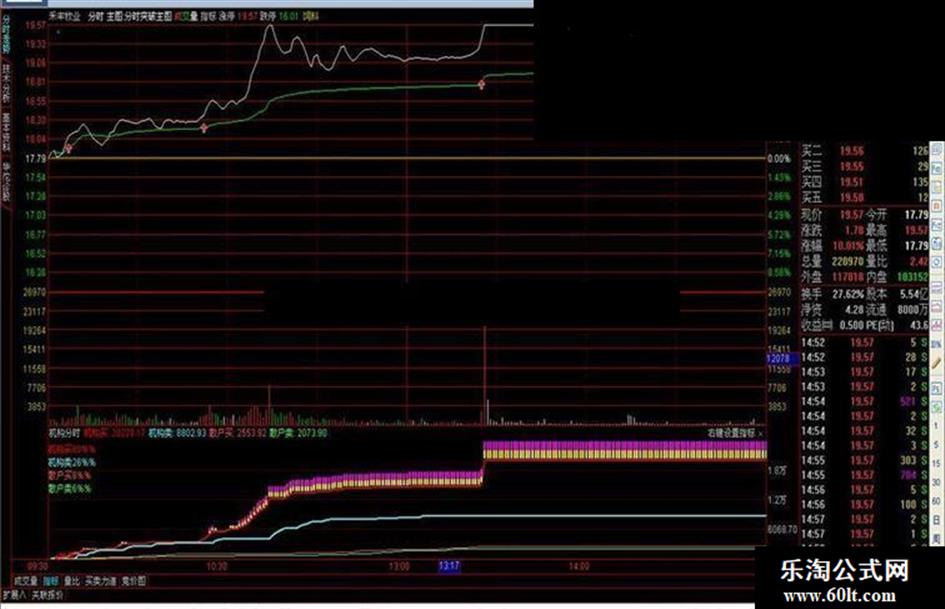 在分时图中,在分时图下面有一个指标切换区,点击指标,然后在分时图下面这个指标切换区点击击鼠标右键,然后在弹出的菜单中选“选择分时指标...”子菜单->【其他类型】->【机构分时 分时专用】。 机构分时指标使用说明1. 指标图左上部按线条颜色用文本标出了机构买、机构卖、散户买和散户卖的百分占比。图中红色粗线为机构买线,天蓝色粗线为机构卖线,红色细线为散户买线,绿色细线为散户卖线。2. 如果机构买入占比超过50%,而且发现有表示强势资金流入的紫线竖线和黄色竖线,此股为机构介入的强势股,当天一般会涨停,出现此类信号提示时就应该马上买入。3. 当天开盘后1小时内,如果在沪深A股报价涨幅的降序排列中发现有个股的机构买入占比超过60%,而且出现强势的紫竖线和黄竖线,此类个股为当天能够涨停的强势股,应该马上买入。操作适当的话,当天就能在抢入后涨7%左右。4. 当天涨停,但机构买入占比小于20%的个股,其后继上涨幅度有限,应该视当时所在点位决定是否出货还是持股。