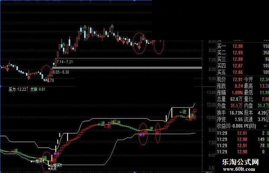 支撑:MA(REF(LLV(C,30),1),2),COLORABFF46; AA1:=AMOUNT/V;BB1:=L<AA1*0.9;