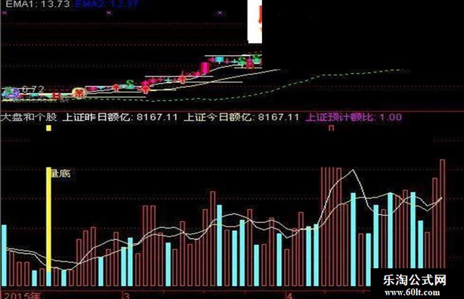 DRAWTEXT((VOL/Y*240)=CONST(LLV(VOL,60)) AND (VOL/Y*240)>CONST(LLV(VOL,总交易日)),CONST(HHV(VOL,70))*0.7,'量底'),COLORYELLOW;