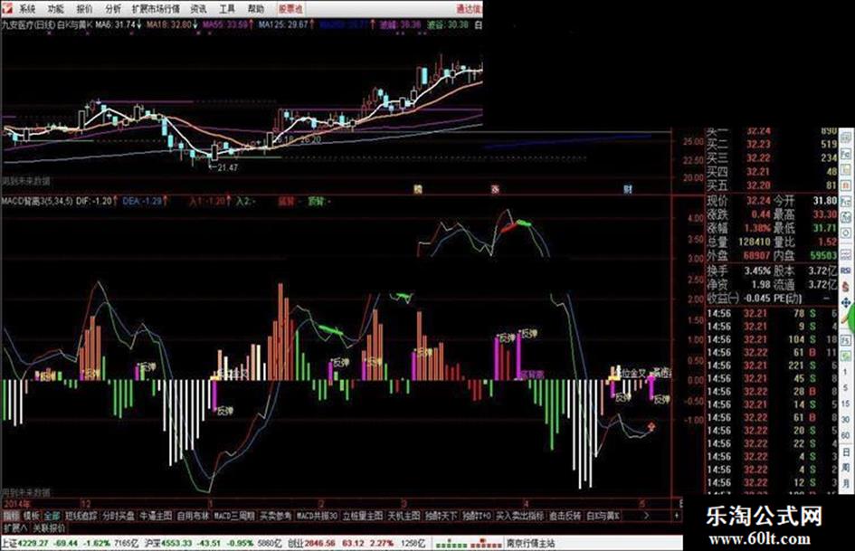 本文采用彩柱的形式更加直观的表现了上涨和下跌,尤其是底部背离的状态和低位金叉的时候,这样的机会一定要引起重视,参数设置采用的是5,34,5,非传统12,26,9,信号来的更加准确