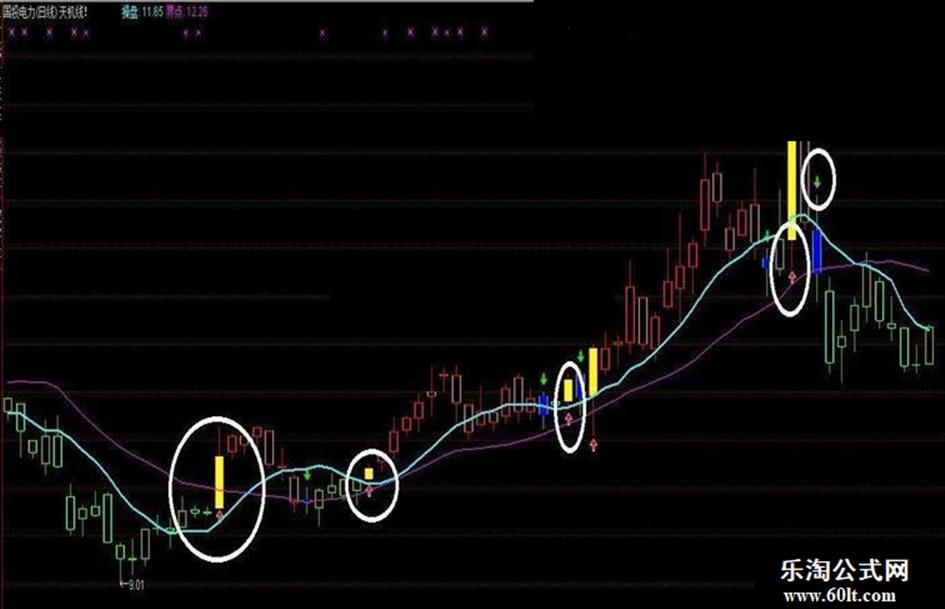 天机不可泄露,呵呵。这个也简单。看图。我标的有。黄色柱子下面红色上箭头:买入, 深蓝色柱子绿色下箭头:卖出。配合资金量使用比较合适.