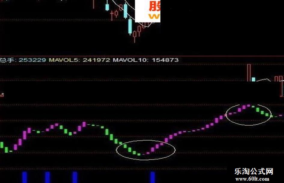 用法:出现图片中椭圆圈住的形态就可以抄底逃顶,此指标,蓝色转为粉色可进场抄底,粉色转蓝色卖出可逃顶。