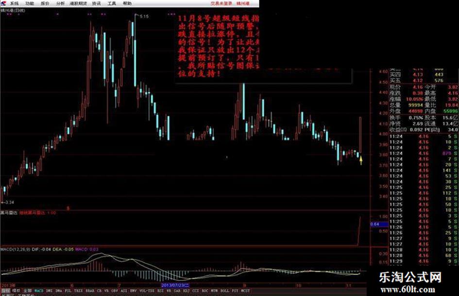 给大家送出的一定是精品,先来看看大盘的情况,从目前的走势来看股指做空的朋友们要笑了,上证指数的大部分均线都被跌破,短期已到2100点整数关口,但这个点位没有什么支撑,结合箱体理论,大盘下一个箱底在2050点。当然到箱底的过程不会那么快,多头还会有不停的抵抗。但在这个过程中仍然会有一些好股票出来,大部分做短线的股民朋友仍然在征战,这当中的风险可想而知,应我的几个忠实粉丝的极力要求,通过一周的编写,一周的实盘验证,今天出炉超级短线黑马雷达指标,96%以上的成功率,不需要从众多股票中选股。只需傻瓜式操作就可以了,这个指标是根据我的炒股风格,结合了MACD指标的信号,同时结合了强势平台突破来综合狙击短线黑马,可以做到超稳,超准,超牛!真正能帮上短线实战的朋友们!假如您拥有该指标就可以做到守若处子,动如脱兔。不出招则已,出招便是一剑封喉!