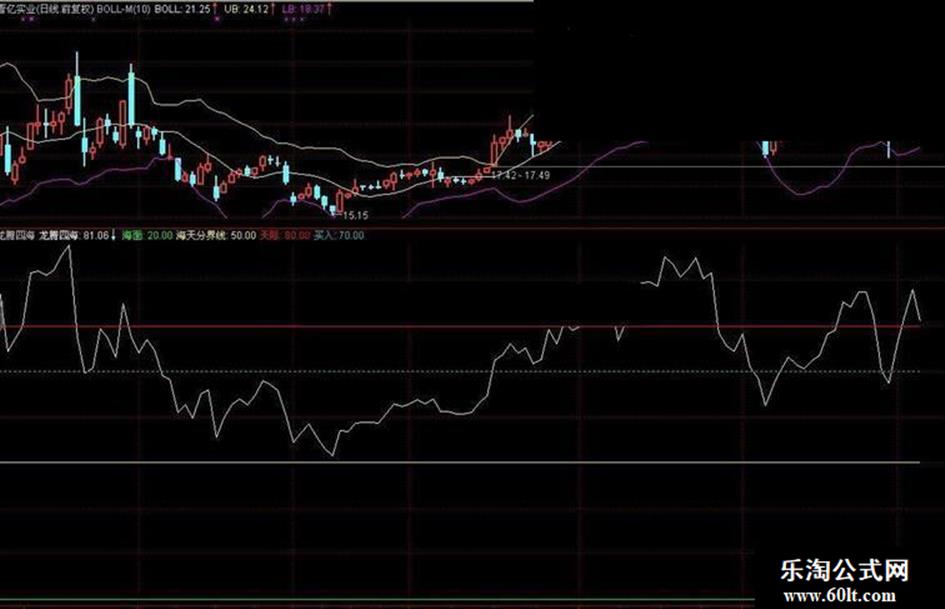 说明;股价上穿70线买进 。这是益盟指标经典,一定要学会应用 龙腾四海:100-100*(HHV(HIGH,5*100)-CLOSE)/(HHV(HIGH,5*100)-LLV(LOW,5*100)); 海面:20,COLORGREEN; 海天分界线:50,COLORYELLOW; 天际:80,COLORRED; 买入:70,DOTLINE,COLORLIBLUE;