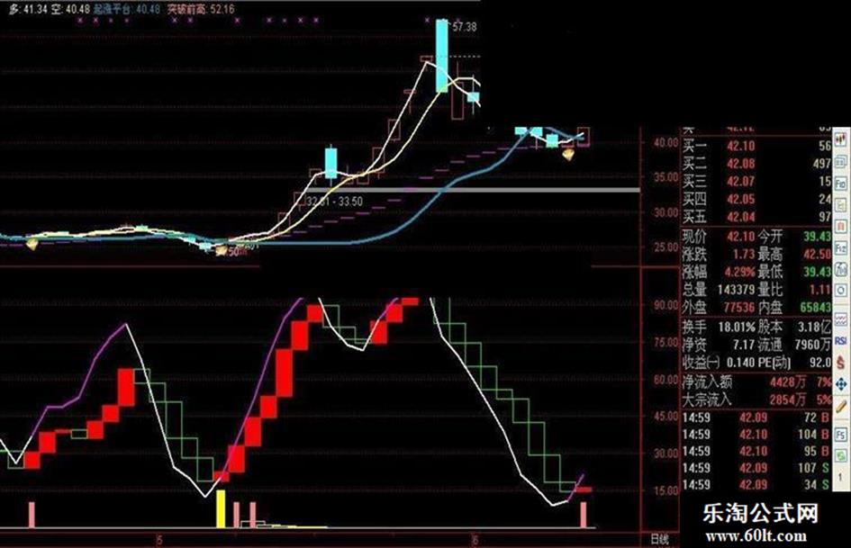 动力线:=IF(EMA((CLOSE-VR2)/(VR3-VR2)*4,4)*25<100,EMA((CLOSE-VR2)/(VR3-VR2)*4,4)*25,100),COLORYELLOW,LINETHICK1;