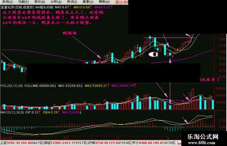 (1)采用5、10和60参数的价格平均线。当5日、10日均线放量上穿60日平均线后,形成鸭颈部。