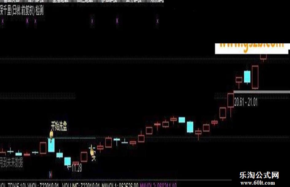 三根洗盘K线,第一根创出60日新高阴线开始,紧跟着连续2根下跌K线,股价回升上穿第一根阴线收盘价2个点出信号。