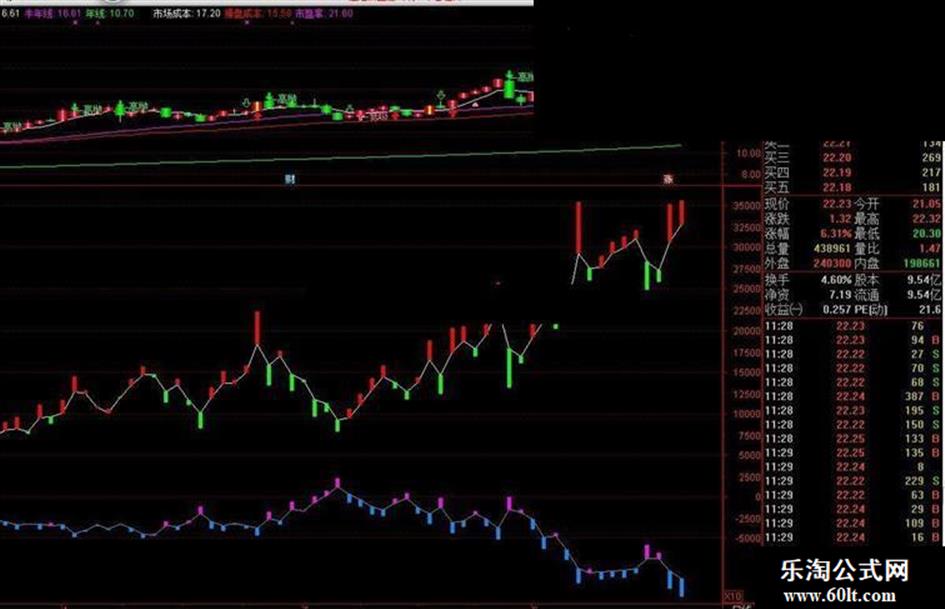{大红表示主买 绿色表示主卖 粉红表示散买 蓝色表示散卖}JJZ:=(HIGH+LOW+CLOSE)/3;QJ0Z:=AMOUNT/IF(HIGH=LOW,4,HIGH-LOW);买1:=QJ0Z*(MIN(OPEN,CLOSE)-LOW);买2:=QJ0Z*(JJZ-MIN(CLOSE,OPEN));卖1:=QJ0Z*(MAX(CLOSE,OPEN)-JJZ);卖2:=QJ0Z*(HIGH-MAX(OPEN,CLOSE));DTZ:=((买1+买2)-(卖1+卖2))/10000;主力持仓:SUM(DTZ,66),COLORWHITE,LINETHICK1;STICKLINE(DTZ>0,主力持仓,主力持仓+DTZ,1,0),COLOR0000FF;STICKLINE(DTZ<0,主力持仓+DTZ,主力持仓,1,0),COLOR00FF00;JJ:=(HIGH+LOW+CLOSE)/3;QJ0:=AMOUNT/IF(HIGH=LOW,4,HIGH-LOW);TD1:=QJ0*(MIN(OPEN,CLOSE)-LOW);DD1:=QJ0*(JJ-MIN(CLOSE,OPEN));DD2:=QJ0*(HIGH-MAX(OPEN,CLOSE));TD2:=QJ0*(MAX(CLOSE,OPEN)-JJ);TD:=TD1-TD2;DA:=DD1-DD2;XD1:=1-(TD1+DD1);XD2:=1-(TD2+DD2);TZ:=V/SUM(V,60)*100;DT:=((XD1-XD2)/10000)/TZ;散户持仓:SUM(DT,22),COLOR888888,LINETHICK1;STICKLINE(DT>0,散户持仓,散户持仓+DT,1,0),COLORFF00FF;STICKLINE(DT<0,散户持仓+DT,散户持仓,1,0),COLORFF8800;