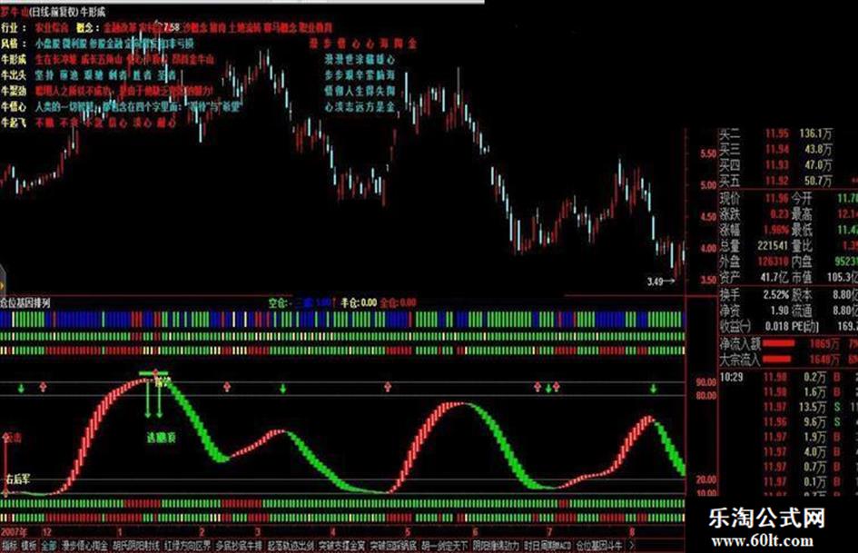 三、关于仓位基因排列。1、公式:由于本人穷,买不起公式,又有点思想,所以只好自学写公式,逼迫到现在,也能写些简单的公式了,公式最下面那一排,是关于短线的,倒数第二排是关于大趋势的,中间那排宽的,是关于短期趋势的,第三排是关于能量的,第二排是关于筹码的,第一排是综合短线,长短趋势,能量及筹码的综合考虑,再加上MACD底顶背离等,说起起有点复杂,公式语言一万多个源码,一千多条语言,千言万语汇成一句话:最上面那排宽的,绿色空仓,蓝色一成仓(最多不能超过三成仓),黄色半仓,红色全仓。(由于大盘没有筹码数据,所以只显第三排)知史明智,大家下载安装后请先对照以前的走势先观察。2、加密:导入加密,密码为:理想妞妞女王辛苦了第一个字母大写(此举为让那些不知感恩,得了便宜还卖乖的人不得不在心里念上一句,嘿嘿!)公式加密,经我自己观察对照以前效果,此公式你要做好了能赚点大钱,做不好可以赚些小钱,只要看懂并执行,至少可保你不赔钱!此公式虽非点石成金,但也是俺的心血所注,并自认为有一定效果,为防小人抄袭拿去卖钱,只好加密了。(斗牛那部分不是这个公式的重点,并且还有点不靠谱,为免误导大家,去掉了)