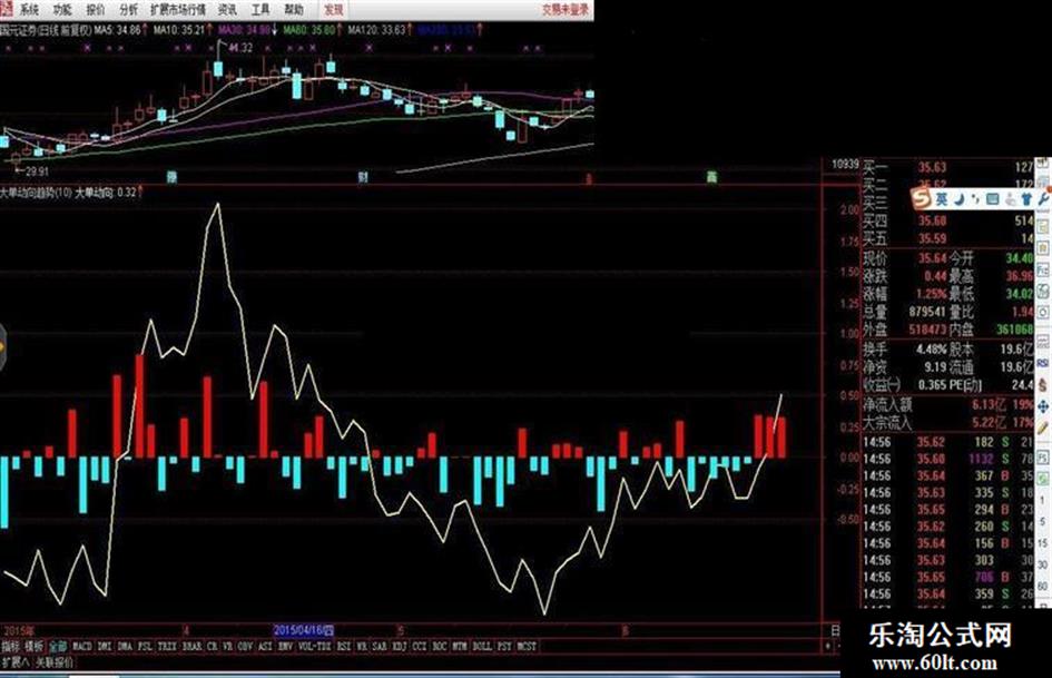 这个趋势线是在通达信官方自带指标的基础上加以发挥而成的,保留了原来的柱线图,趋势线比柱线图更加直观,关键是能显现趋势。用来监控股价涨跌背后大资金的大体流向非常合适,紧跟“主力大部队”走,不致迷失方向。正如下图所示,只要黄色趋势线昂头向上,即使股价横盘或者下跌,咱尽管持有和买进。如果股价一路向上,而黄色趋势线却拐头向下,那可就要警惕了。 例如下图1,6月19日的国元证券,近几日股价持续低迷,而黄色趋势线却一路提升,股价估计离拉升不远了