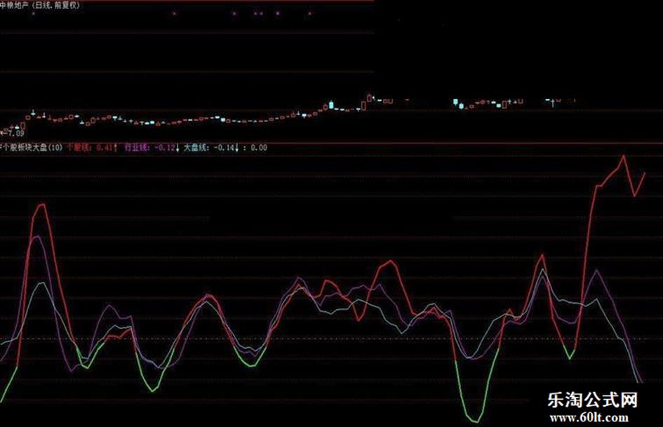 大盘线:=SLOPE(INDEXC,N)/MA(INDEXC,N)*10,COLORCYAN,LINETHICK1;