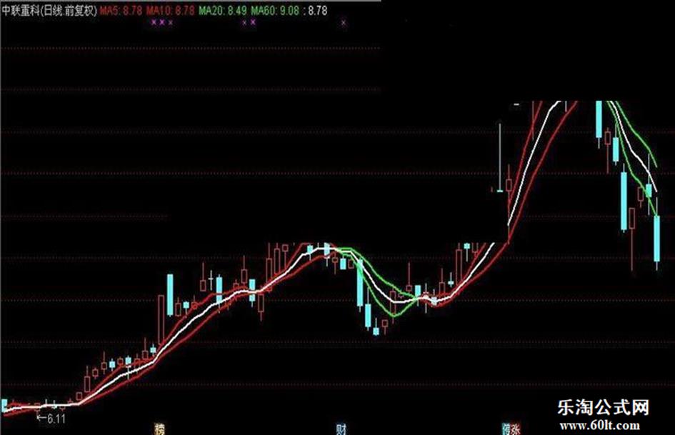 IF (A1<=A2,A2,A3),Color00ff00,linethick2;{5日线小于等于10日且10日线交叉A3线显示粗绿线}