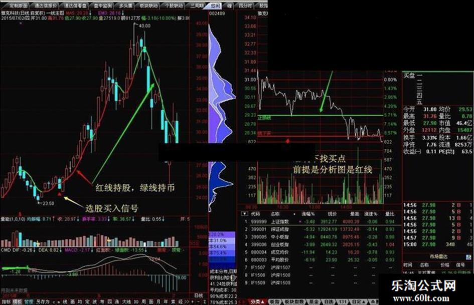 附件里是三个指标,一个是分析主图,一个是分时主图,一个是选股,分析图只有一根线,红线上持股,绿线持币。分时主图有二根线一红一绿,红线下找买点,绿线是止损用的,不一定天天看。还有一个选股,选股状态是5日均线向上,对应大盘也在5日线上,买点价格在5日线下。