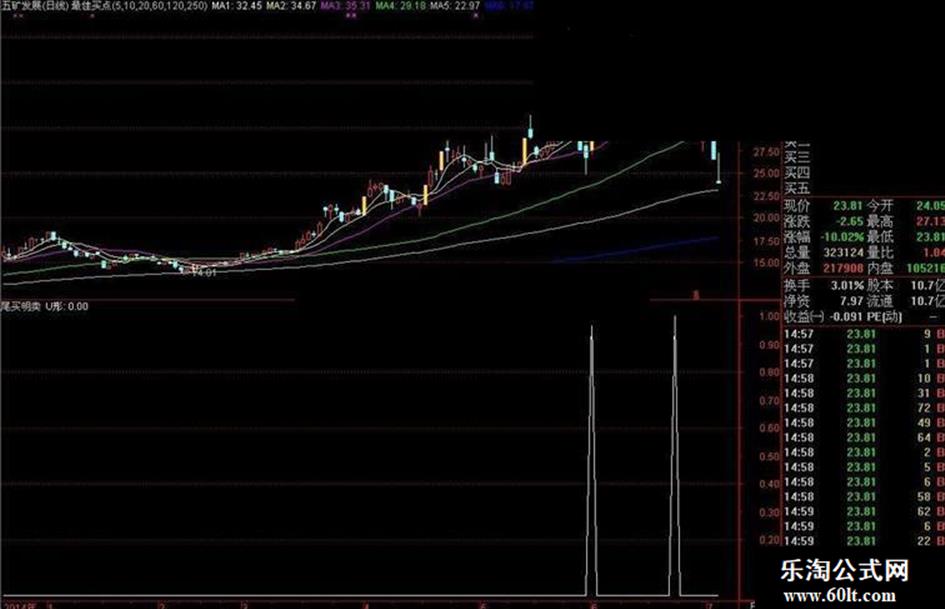 尾买明卖的短线指标,无未来,准确率很高,最新出炉,原创! 现在的股市还是一个投机市,小散没得炒,只有短线,才能保证资金安全,本指标适合2:30后,选股后,自己选择合适的股票买进,第二天早盘冲高卖出。