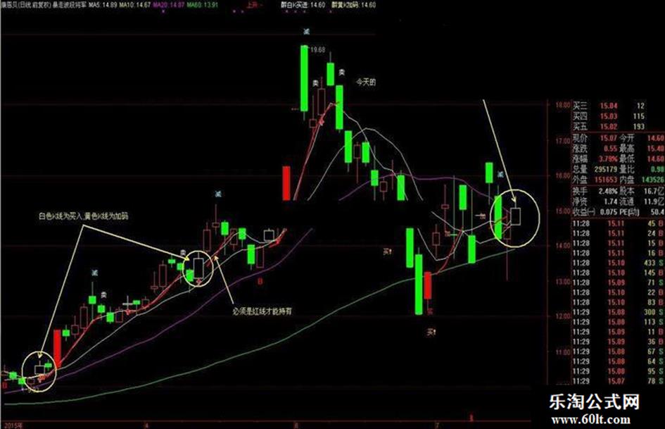 现在来说说用法,用法很简单: 1.必须出现红色线才能持有,红色线消失必须果断离场. 2.出现白色K线为买入,黄色K线为加仓(这只是一个买入时机,第2天能否继续持有就得看红色线是否出现.)