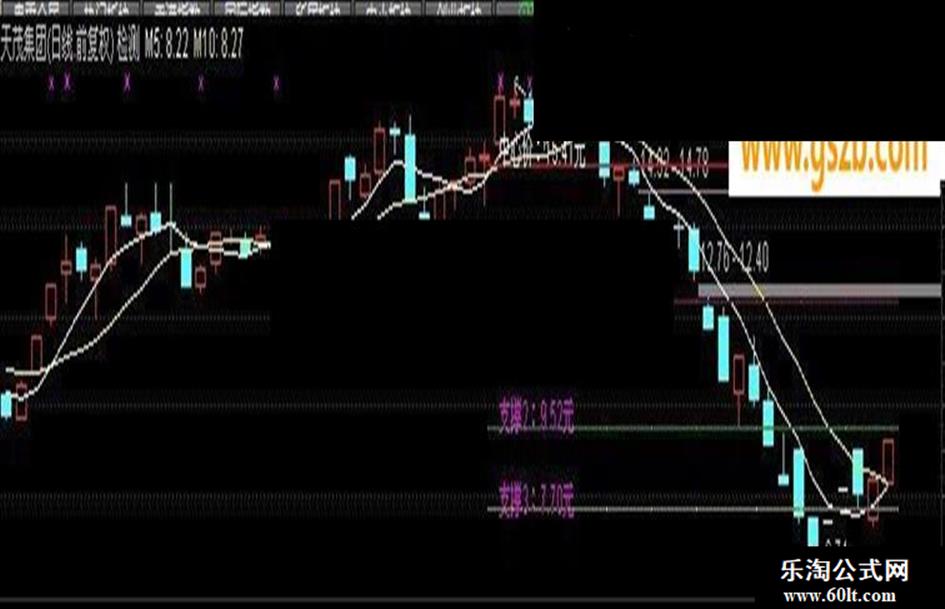 DRAWTEXT(T=0,REF(D-D*0.380,T)*1.02,VARCAT(VARCAT('支撑2:',VAR2STR(REF(D-D*0.382,T),2)),'元')),COLORMAGENTA;