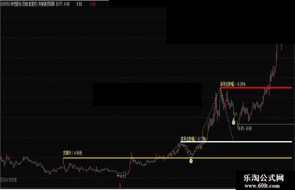 DRAWTEXT(QFT=0,REF(H,TY)*1.05,VARCAT(VARCAT('支撑价:',VAR2STR(REF(H,TY),2)),'元'))COLORYELLOW;