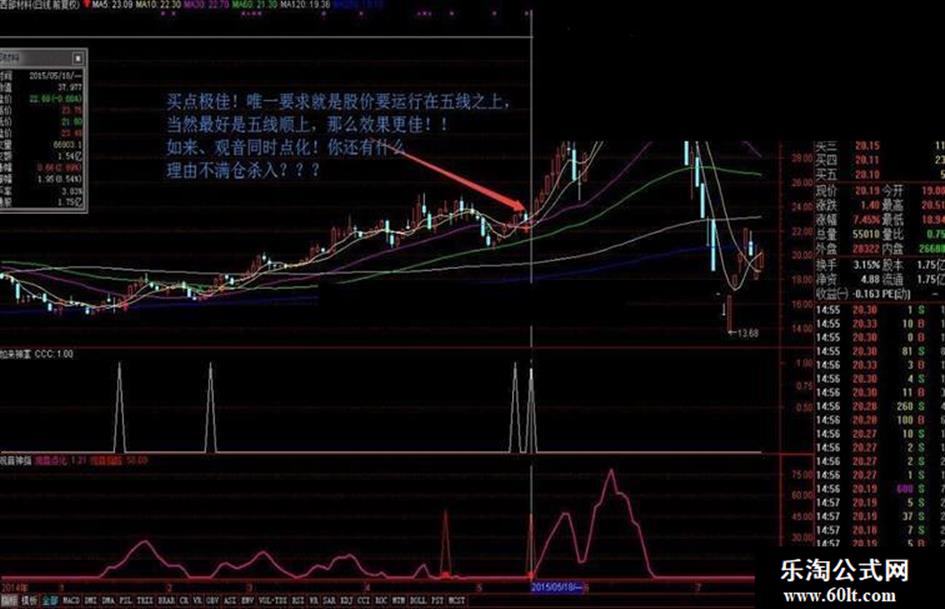 二个指标同时使用,唯一要注意的一点就是,股价必须运行在五线之上(五线顺上更好),二指标信号出现共震,即为最佳买点。坐待收钱了!送给有缘人!!请点喜灯迎接!!!”