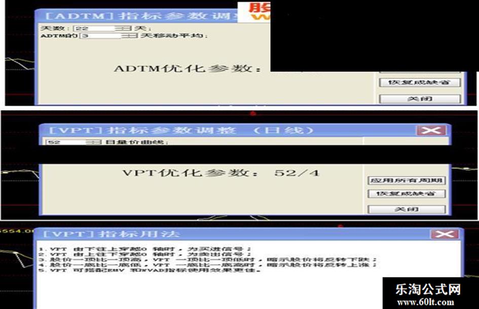 下面两个副图指标分别为:VPT:量价曲线(设置优化参数:52/4),ADTM(动态买卖指标)优化参数为:22/3,这三个组合指标可以帮你分析与选股做为参考依据.