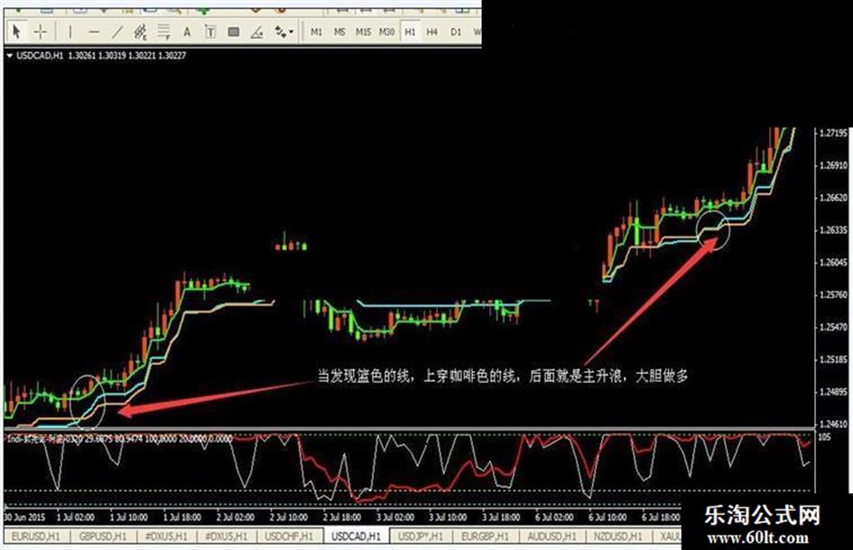 主升浪 当发现篮色的线,上穿咖啡色的线,后面就是主升浪,大胆做多 。