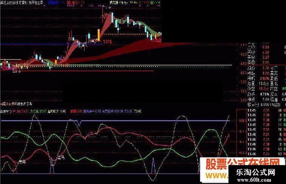 大势已去:IF(CROSS(黑马线,A1) AND 黑马线>70 AND 趋势线>80,90,100),LINETHICK2,COLORE66878;