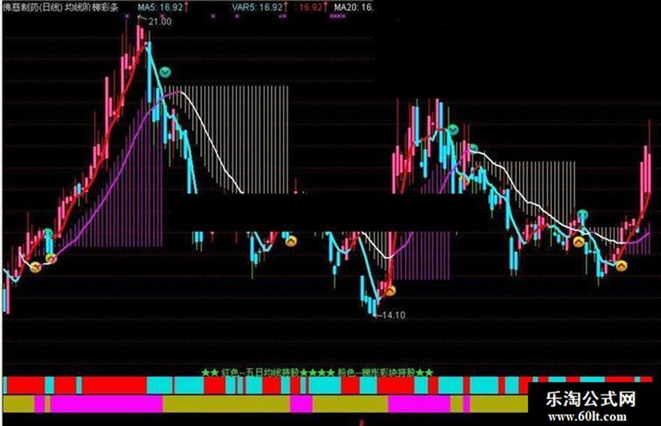 DRAWTEXT_FIX(1,0.3,0.87,0,'★★ 红色--五日均线持股★★★★ 粉色--梯形彩块持股★★'),COLOR00FF00;