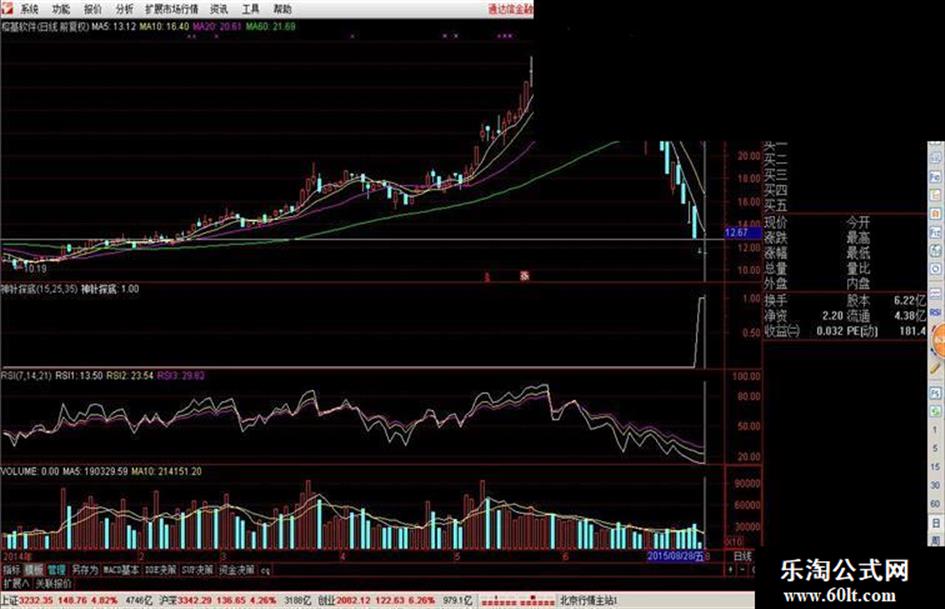 "探底神针"RSI指标具体应用步骤如下: 1、需要将RSI指标的N参数分别设置为7日、14日、21日。 2、当股价经过大幅度的调整走势后,密切观察探底神针"RSI"指标的见底信号,要求7日RSI必须小于10、14日RSI指标必须小于20、21日RSI指标必须小于30。 3、当RSI指标达到上述标准后,如果股价继续下跌,而RSI指标出现明显止跌信号,并与股价走势背离,则需重点关注。 4、如果RSI指标出现7日线上穿14日线和14日线上穿21日线的黄金交叉,并且RSI三线呈现出多头排列,表明RSI指标已经完成了买入信号的提示作用。 5、观察成交量变化。当RSI指标符合上述技术要求时,投资者需要观察成交量的动向。对于成交量的观察有两种:一种是当RSI出现上述技术特征时,成交量是否极度萎缩,甚至出现地量水平。如果成交稀少,则表明该股即将完成探底,投资者可以积极介入。 另一种量能观察是当该股完成探底,投资者及时介入后,则需要观察该股能否出现有实质性增量资金介入的放量过程,如果不能有效放量,则说明目前的底部仍是阶段性底部,投资者需要以短线反弹行情对待。如果该股探底成功后,量能有效持续性地放大,则投资者可以将其视为个股的重要底部,并坚定持股。