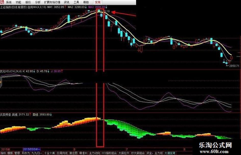 3、在局势不明朗的情况下,用后面的优化KDJ、买卖频谱这两个指标作辅佐和验证,防止无效信号干扰,保证买卖信号的准确性。