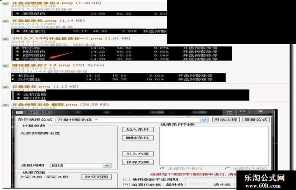 今天也就是2015.7.14日 预警列表 出现信号 603788 603099 603918 !注意看我的截图时间,当然也出了写开盘直接涨停的股票~ 我们以不追高、保守的方法 直接排除涨停个股,狙击涨停