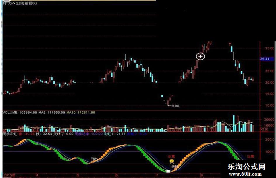 DRAWTEXT(CROSS(涨,跌) AND 跌<20 AND 跌>-10,40,'日出'),COLORFFFFFF;