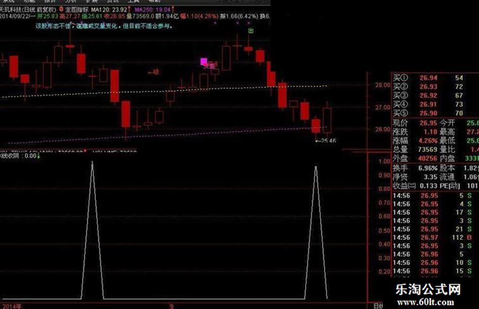 DRAWTEXT_FIX(情况13=1,0.10,0,0,'该股形态不佳,注意成交量变化,但目前不适合参与。'),COLORFFFF00;