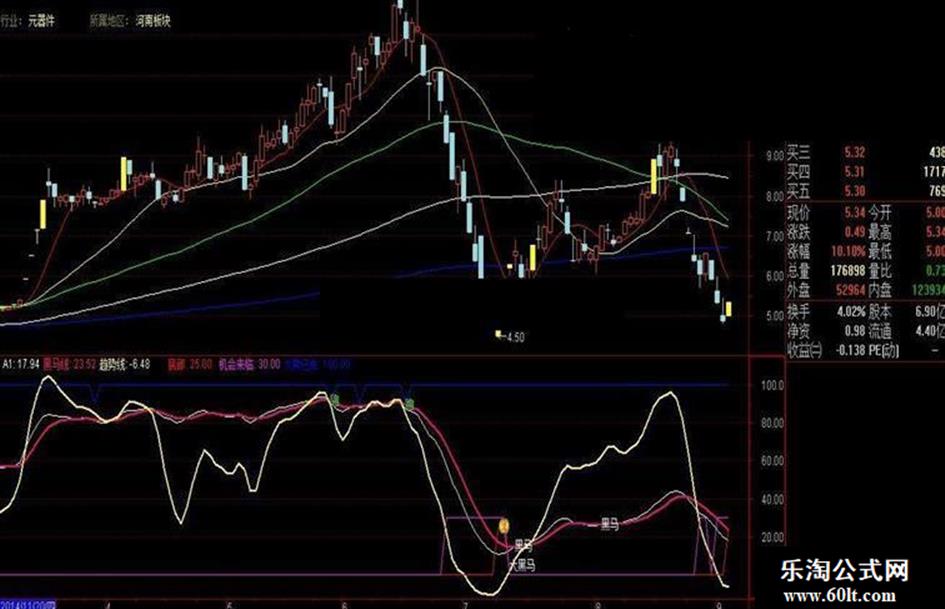 黑马线:EMA(A1,5),LINETHICK2,COLOR6600FF;
