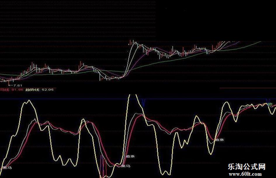 DRAWTEXT(CROSS(黑马线,A5)AND 趋势线<80,黑马线,'追涨');