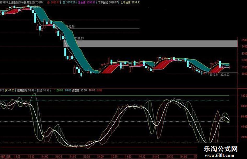 当经过股市的一场灾难,新股民才意识到判断大盘和个股的顶和底有多重要!这一点老股民早就有深刻的体会。可是如何解决这个问题?绝大多数股民一直没法弄清楚其中的奥秘。这里涉及到太多的问题,其中主要的是股民们使用的技术指标都是经典的,并且只对某个周期有效,当多个周期同时考察时会出现彼此矛盾的结果,使得使用者无法得到正确的决断。 为了上述问题我发现了论坛,这里高手林立,各有各的高招,可惜和我的观念不一致。直到有一天,我在论坛里发现了一个主图:通道生命平台,如下图(日级别。可惜时间久远,忘了作者的名字,在此向作者表示敬意与感谢) 可以看到,主图简明扼要,清晰准确,没有复杂的其他东西使人眼花缭乱。这是我常用的主图之一。为了与这个主图搭配,设计了一个附图,经过长时间的检验,觉得非常有效,最重要的是各个周期之间关系基本一致,不信,请您分别看下面的60、30、15、5和1分钟的图。60分钟
