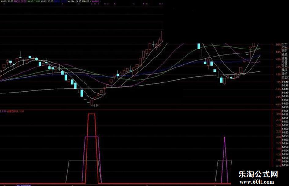 中线买:IF(绝佳买点>10000 AND 绝佳买点>20000,2,0),COLORFF00FF,LINETHICK2;