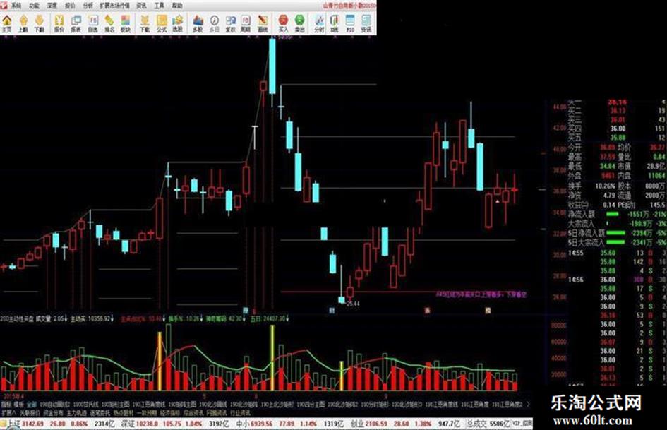 A45:IF(压力线1=REF(压力线1,1),(压力线1-支撑线1)*3/8+支撑线1,DRAWNULL),COLORRED;