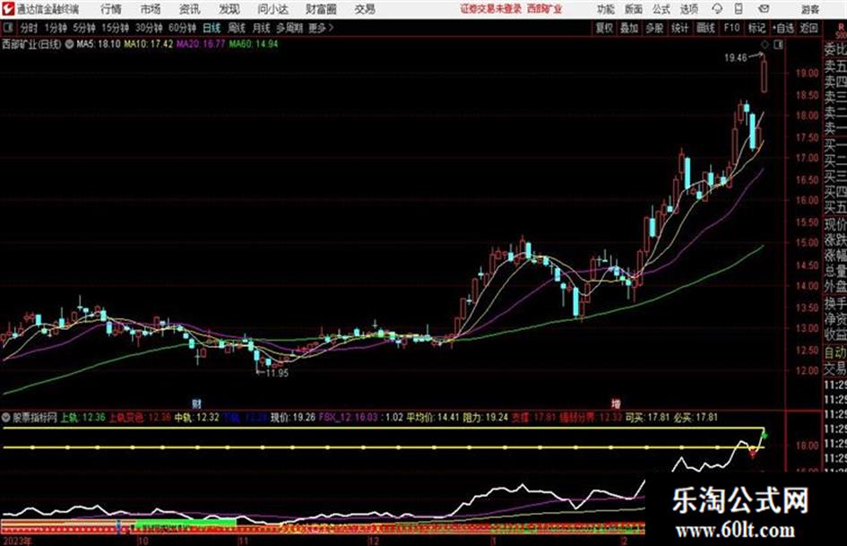 下轨2:=IF(NP>FP,IF(UTL<=RH,UTL,DRAWNULL),IF(UTL>=RL,UTL,DRAWNULL)),COLOR00EE00,,DOTLINE;