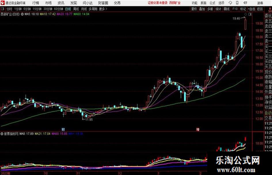 输出MA60:如果JJJT,返回0.01*成交额(元)的P3日指数移动平均/成交量(手)的P3日指数移动平均,否则返回(最高价+最低价+收盘价)/3的P3日指数移动平均画洋红色 线宽为2