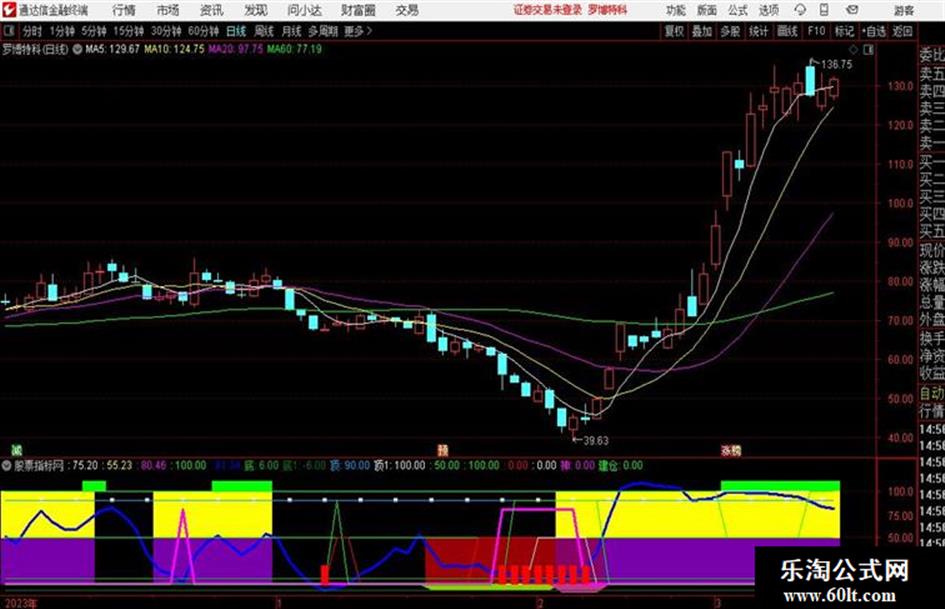 神:( IF(((动向趋势线 > 88) AND (神偷线 < 5.8)),80,0)),LINETHICK3,COLORFF00FF;