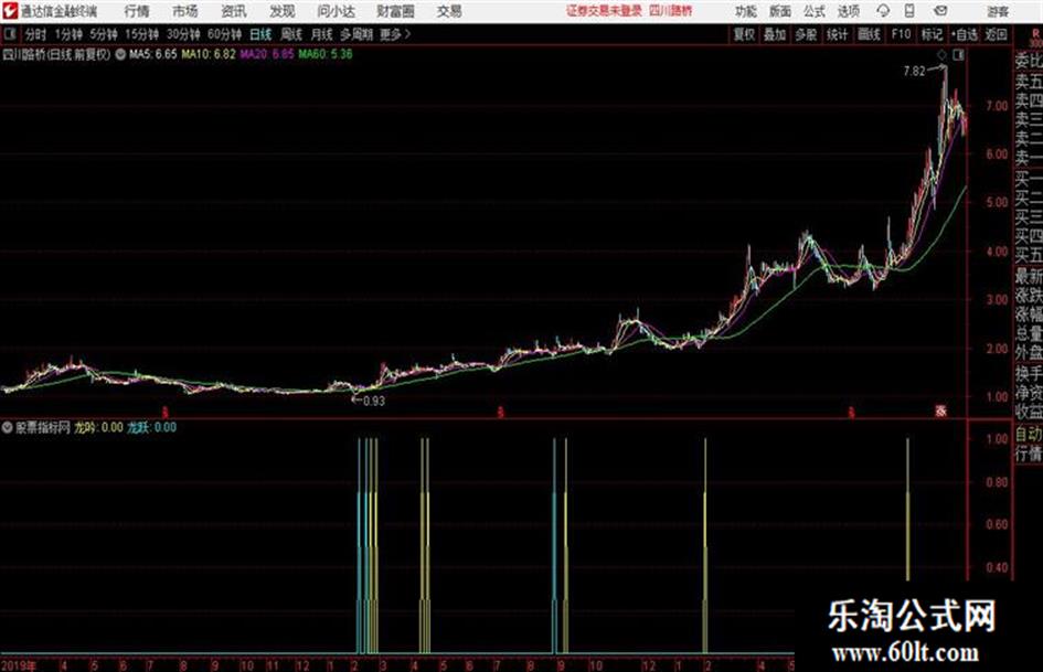 X2:=C<=REF(C,1) AND C>=O;X3:=X1>0 OR X2>0;XT0:=BARSLAST(X3);X4:=MAX(REF(C,XT0),REF(O,XT0));X5:=REF(V,XT0);YT:=XT0>0 AND C>X4 AND V>X4*1.1;YS:=IF(YT>0 AND REF(YT,1)=0,10,0);YSJ:=YS>0;XA1:=(CLOSE/REF(CLOSE,1)>1.098 OR C/O>1.098) AND V<HHV(V,21);X0:=NOT(NAMELIKE('S') OR NAMELIKE('*S')) AND VOL>1;XA2:=BARSLAST(XA1); XA31:=(L>=REF(L,XA2) AND (L-REF(L,XA2))<=0.03); XA32:=(L>=REF(C,XA2)*0.99 AND (L-REF(C,XA2))<=0.03) ; XA33:=(0>=REF(C,XA2)*0.99 AND (0-REF(C,XA2))<=0.03); XA3:=XA31 OR XA32 OR XA33; 龙吟:YSJ AND C>O AND C>REF(C,1) AND XA3 AND (XA2<21 OR COUNT(REF(XA2,1),21)>=1) AND X0,COLORYELLOW; YB:=(C-REF(C,1))*100/REF(C,1)>=9.9 AND L=H;XA4:=(ATAN((MA(C,5)/REF(MA(C,5),1)-1)*100)*180/3.14115926);XA5:=MA(XA4,5);XA6:=PLOYLINE(CROSS(XA4,XA5),XA5);XA7:=PLOYLINE(CROSS(XA5,XA4),XA4);XA8:=COUNT(CROSS(XA4,XA5),XA6<REF(XA6,5) AND XA7>REF(XA7,5));XA9:=CROSS(EMA(C,3),EMA(C,21));XA10:=CROSS(MA(C,3),MA(C,21));XA11:=((MAX(C,O)-MIN(C,O))/MIN(C,O))*100;XA12:=(CLOSE/REF(CLOSE,1)<=0.96 OR CLOSE/OPEN<=0.96) AND (V/HHV(V,20)<=0.618 OR VOL/REF(VOL,1)<=0.5 OR VOL<HHV(VOL,5));XA13:=(CLOSE/REF(CLOSE,1)>=1.04 OR CLOSE/OPEN>=1.04) AND (V/HHV(V,20)<=0.618 OR VOL/REF(VOL,1)<=0.5 OR VOL<HHV(VOL,5)) AND C>REF(C,1) AND HIGH>LOW;XA14:=O>REF(C,1) AND C>REF(C,1) AND H>(H,1);XA15:=(REF(C<REF(C,1) AND V/REF(V,1)<0.67,2) OR REF(XA12,2) OR REF(XA13,2)) AND REF(XA11<3,1) AND REF(V,1)<REF(V,2) AND XA14;XA16:=O>REF(CLOSE,1) AND CLOSE>OPEN AND CLOSE>REF(O,1);XA17:=(REF(XA12,1) AND XA16 AND XA13) OR XA15;XA18:=(CROSS(C,MA(C,5)) AND CROSS(C,MA(C,13)) AND CROSS(C,MA(C,21)) OR CROSS(C,MA(C,34))) AND MA(C,5)>REF(MA(C,5),1);XA19:=MA(C,5)>REF(MA(C,5),1) AND MA(C,5)>MA(C,10) AND MA(C,10)>=MA(C,20);XA20:=XA18 AND 龙吟 AND NOT(YB) AND (XA8 OR XA10 OR XA9 OR CROSS(C,MA(C,20)));XA21:=龙吟 AND (V/REF(V,1)>1.5 OR REF(V,1)/REF(V,2)<0.67) AND (XA8 OR XA10 OR XA9 OR CROSS(C,MA(C,20))) AND NOT(O/REF(C,1)>1.06) AND NOT(YB) AND X0,COLORMAGENTA;XA22:=C>O AND C>REF(C,1) {AND V>REF(V,1)} AND XA17 AND (COUNT(龙吟,8)=1 OR XA18) AND NOT(YB) AND (XA8 OR XA10 OR XA9 OR CROSS(C,MA(C,20))) AND X0,COLORGREEN; 龙跃:(XA20 OR XA21 OR XA22),COLORCYAN;