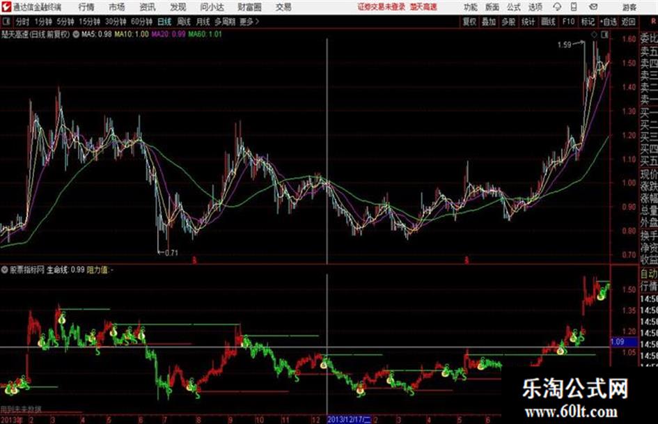 STICKLINE(买线>=卖线,LOW,HIGH,0,1),COLORRED;